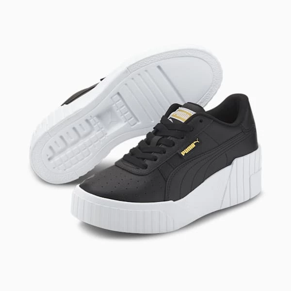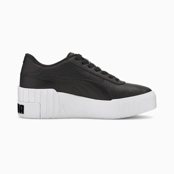 Higher and hotter than ever. Meet the Cali Wedge: a bold update to the Cali silhouette with an extreme wedge sole and bold branding.<h3> DETAILS </h3><ul><li>Modern Cali silhouette</li><li>Synthetic leather upper with perforated vamp</li><li>Full lace closure</li><li>Platform midsole design with wedge heel</li><li>Rubber outsole provides traction and grip</li><li>Gold metallic PUMA branded tab at lateral side</li><li>Woven PUMA label at tongue</li></ul>