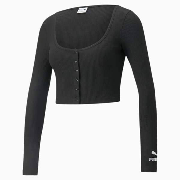 Flaunt your physique in this tight-fitting long sleeve tee. With press-stud fastenings down the front and a super-flattering scoop neckline, it’s perfect for layering over a slinky vest or bralette for a relaxed feminine feel.<h3>FEATURES & BENEFITS</h3><ul><li>Contains Recycled Material: Made with recycled fibers. One of PUMA’s answers to reduce our environmental impact.</li></ul><h3>DETAILS</h3><ul><li>Tight fit</li><li>Cropped length</li><li>Scooped neckline</li><li>Press-stud fastenings down the front</li><li>Long sleeves</li><li>Embroidered PUMA Archive No. 1 Logo on left sleeve</li></ul>