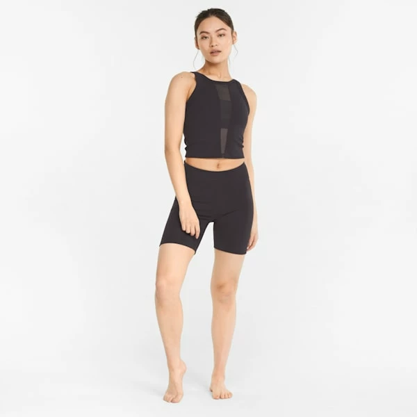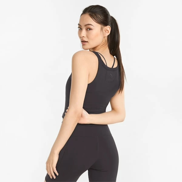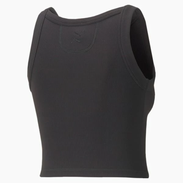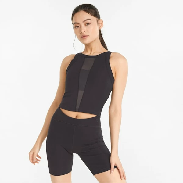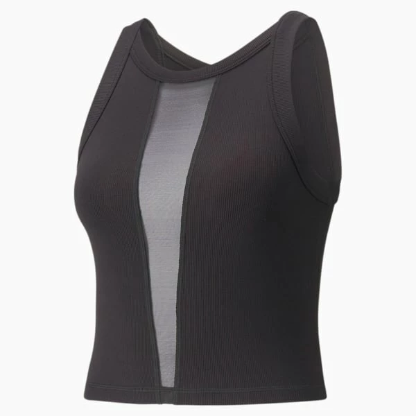 Simple is chic in this studio-ready style. Featuring a deep V-neck and tactile texturing for an air of added elegance, the Exhale Ribbed Training Tank Top will have you feeling fiercely feminine. Cool and cropped, with a tight fit and embroidered brand elements, all eyes will be on you.<h3>FEATURES & BENEFITS</h3><ul><li>Contains Recycled Material: Made with recycled fibers. One of PUMA’s answers to reduce our environmental impact.</li></ul><h3>DETAILS</h3><ul><li>Tight fit</li><li>Ribbed construction</li><li>Recycled power mesh center insert</li><li>Embroidered PUMA Cat Logo in mirrored formation at back of neck</li></ul>