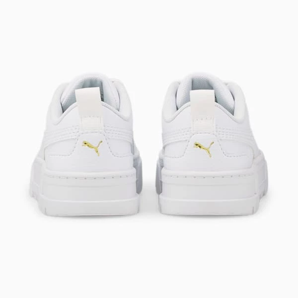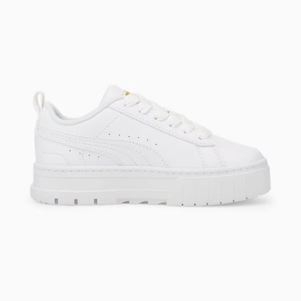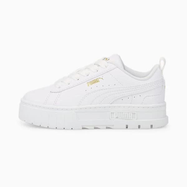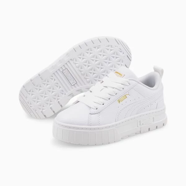 Taking design elements from the urban environment and injecting them with extra edge, the Mayze encompasses attitude. A classic PUMA silhouette, this eye-catching iteration has all the hallmarks of the original, like the textured and stacked rubber sole, but adds a sleek synthetic leather upper for a more modern spin on street style. Featuring a lightweight construction for all-day comfort, this progressive pair will let your little ones stand out in style.<h3>DETAILS</h3><ul><li>Synthetic leather upper</li><li>Rubber midsole and outsole</li><li>Lace closure for a snug fit</li><li>Synthetic overlay on heel and eyestay</li><li>Debossed and foil-printed PUMA No. 2 Logo at quarter</li><li>Synthetic PUMA Formstrip at medial and lateral sides</li><li>Debossed and foil-printed PUMA Cat Logo at heel</li><li>PUMA Archive No. 1 Label at tongue</li><li>PUMA Kids’ style: Recommended for young kids between 4 and 8 years</li></ul>