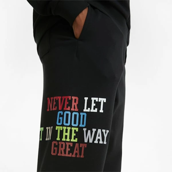 Let your ambition lead you in these inspiring basketball pants from our Playbook range, featuring audacious, oversized graphics down the leg. A stylish cuffed silhouette and elasticated waist are designed for a snug, secure fit during play – so there’s nothing to stand between you and your next challenge. They pair perfectly with the Playbook hoodie for a matching motivational look.<h3>FEATURES & BENEFITS</h3><ul><li>Contains Recycled Material: Made with recycled fibers. One of PUMA’s answers to reduce our environmental impact.</li></ul><h3>DETAILS</h3><ul><li>Cuffed ankles</li><li>Elasticated waistband</li><li>Graphics at left leg</li><li>Cotton and recycled polyester</li></ul>