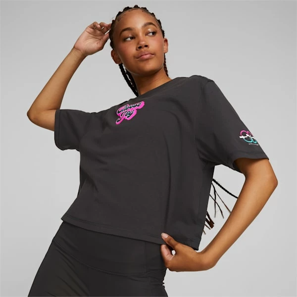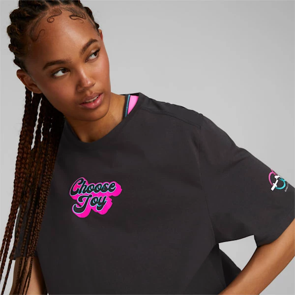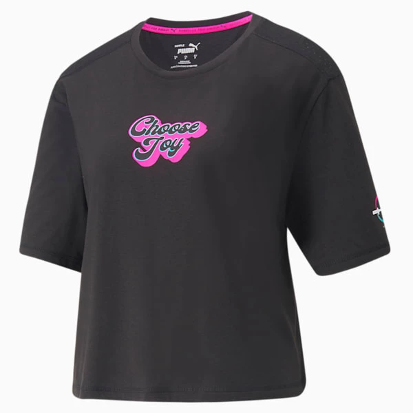 <h3> PRODUCT STORY </h3><p>PUMA has once again partnered with Barbells for Boobs in support of breast cancer awareness and the organization’s RAD (Resources After Diagnosis) program, which emphasizes the importance of physical activity in breast cancer risk reduction, treatment, and survivorship. The PUMA x BARBELLS FOR BOOBS collection features training and lifestyle pieces with empowering graphics and uplifting pops of color. Choose Joy.</p><h3> FEATURES & BENEFITS </h3><ul><li>DRY: dryCELL: Performance technology designed to wick moisture from the body and keep you free of sweat during exercise</li><li>FOREVER BETTER: Made with at least 20% recycled material as a step toward a better future</li></ul><h3> DETAILS </h3><ul><li>Regular fit</li><li>Flatlock stitching for less friction and higher comfort during exercise</li><li>Large graphic on front</li><li>Collaboration branding on left sleeve</li></ul>